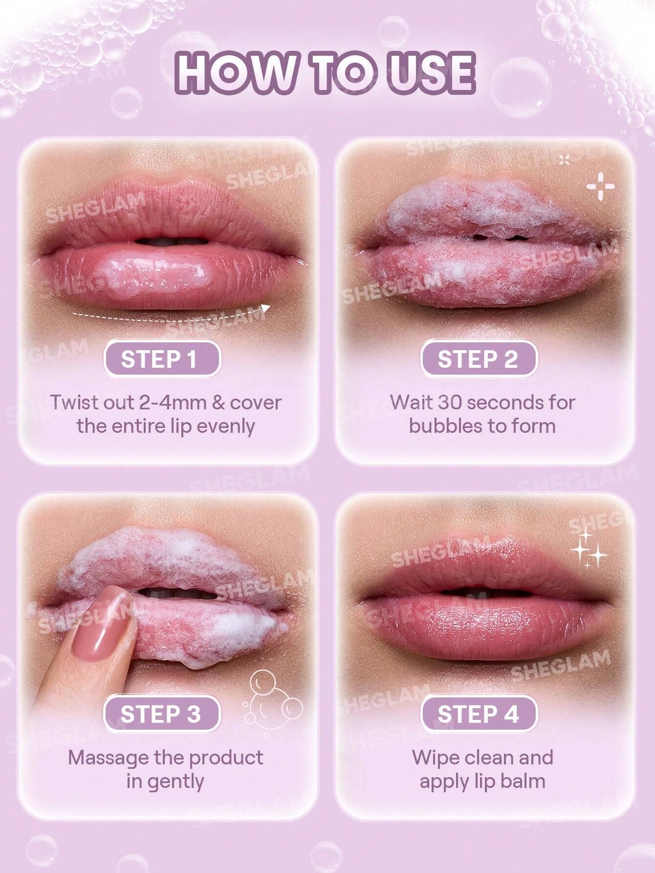 Sheglam Bubble Buff Lip Scrub” را می‌توان 1 تا 2 بار در هفته، بسته به نیاز لب‌ها، در روتین مراقبت از لب خود جای داد. بهترین زمان استفاده معمولاً قبل از خواب یا قبل از شروع آرایش است. پس از استفاده از اسکراب و پاک کردن آن، حتماً از یک بالم لب مغذی یا ماسک لب برای آبرسانی عمیق و محافظت از لب‌های تازه لایه‌برداری شده استفاده کنید.