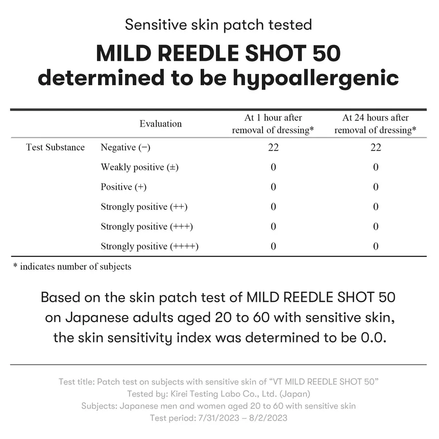 VT – Mild Reedle Shot 50 برای انواع پوستها مناسب است، از جمله پوستهای حساس و مستعد آکنه. این محصول غیر کومدوژنیک است، به این معنی که منافذ پوست را مسدود نمیکند و باعث ایجاد جوش نمی شود.