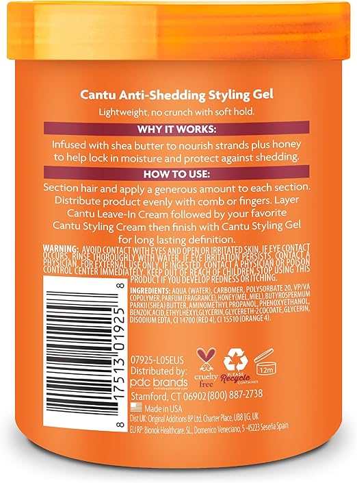 ژل حالت دهنده ضد ریزش کانتو Cantu Flexible Hold Anti-Shedding Styling Gel with Honey این محصول از برند کانتو Cantu، که به دلیل تمرکزش بر مراقبت از موهای مجعد، فر، و موجدار (به ویژه موهای نوع 3 و 4) شناخته شده است، یک ژل حالت دهنده است که علاوه بر تثبیت حالت مو، به تقویت و کاهش ریزش مو نیز کمک میکند. ژل حالت دهنده ضد ریزش کانتو با فرمولاسیون بدون مواد مضر رایج، برای تغذیه و سلامت موها طراحی شده است.