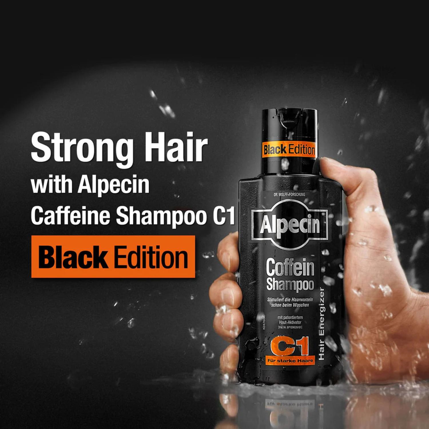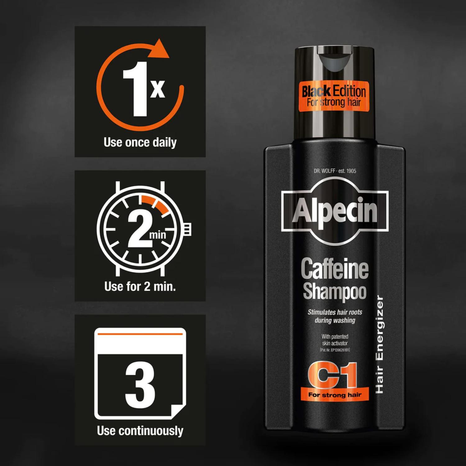 شامپو ضد ریزش کافئین دار سیاه آلپسین C1 ا Black Edition 250ml ؛ استفاده منظم و طولانی مدت از شامپو آلپسین سی وان مشکی، به جلوگیری از پیری زودرس مو کمک کند. این شامپو  یک نسخه قوی تر به نسبت شامپو کافئین میباشد. بعد از استفاده این شامپو میتوان تاثیر سریع آن را بعد از 2 دقیقه ماندگاری روی کف سر مشاهده کرد.